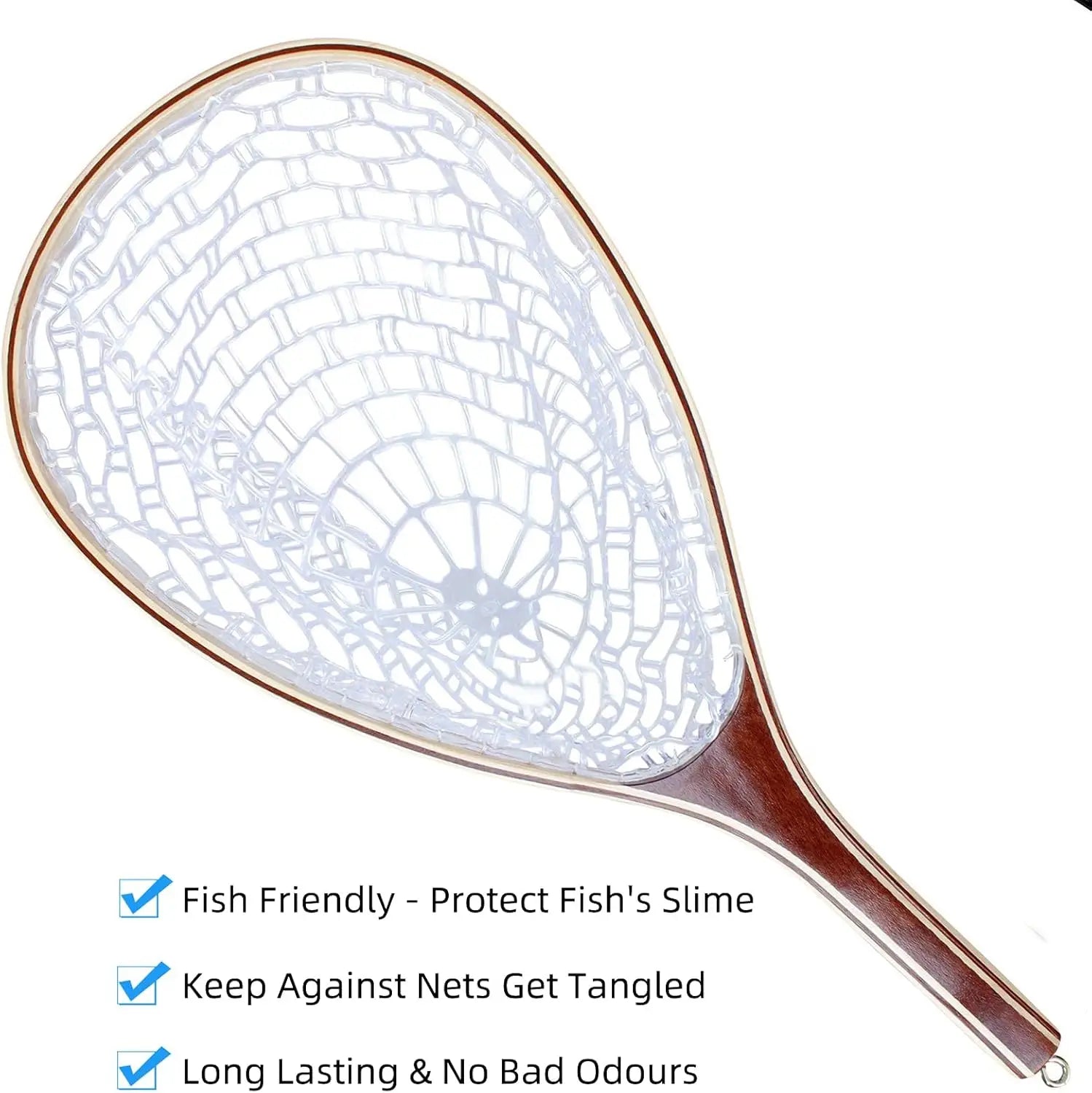 Fishing Net for Trout, Fly Fishing Net with Soft Rubber Mesh, Wooden Handle for Freshwater Saltwater Fishing, Catch and Release
