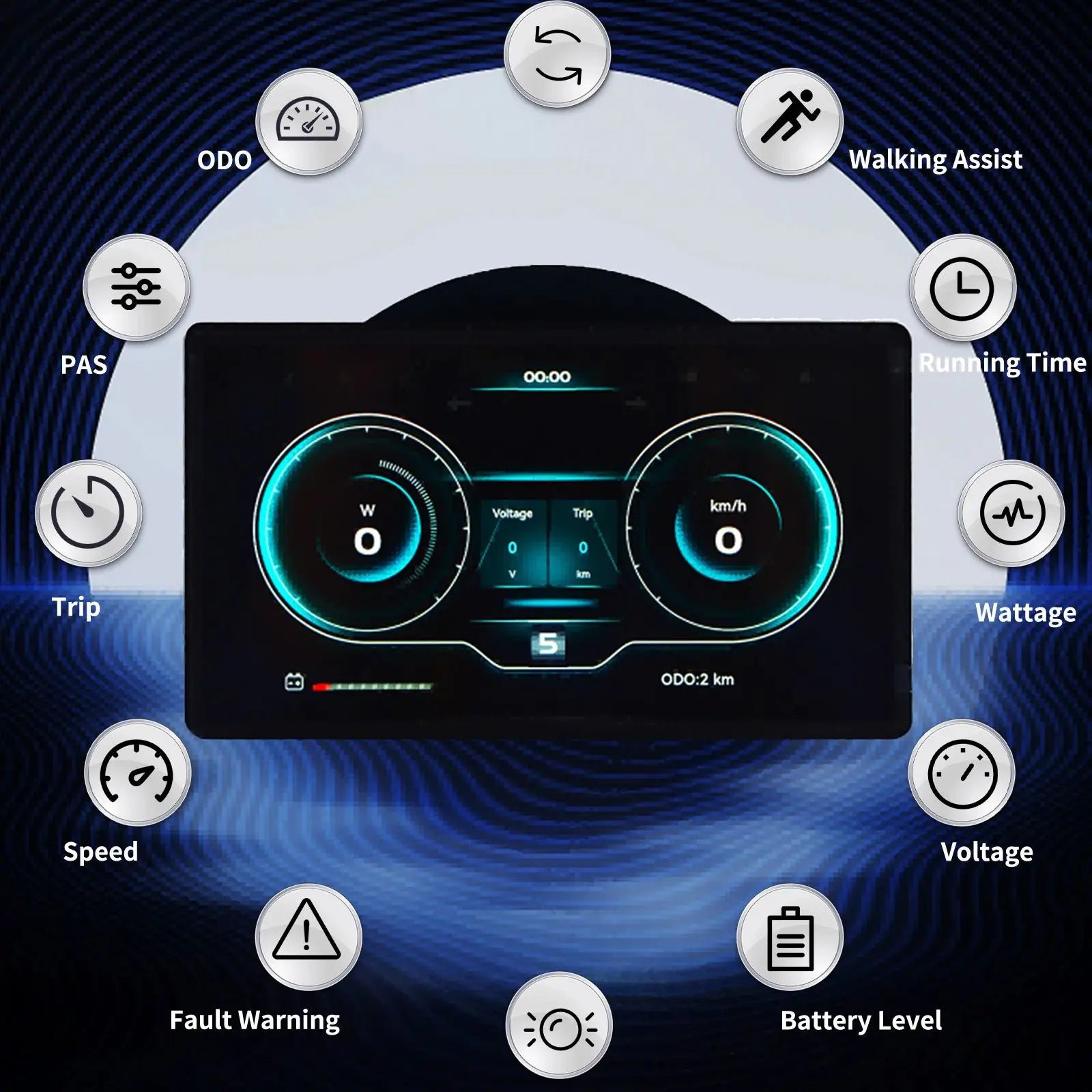 - Includes battery indicator, PAS levels, walking mode, fault indicator, and a clear speed readout for safer, smoother rides and longer adventures through city streets or trails.